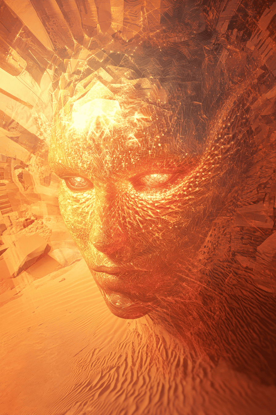 She sees the desert around them—crimson sand, darkening sky, the anchor stone with its blood sigil gleaming wet. And simultaneously, she experiences angular architectures that bear no resemblance to physical landscape. Structures that suggest architecture without being buildings. Patterns that imply meaning without using symbols.